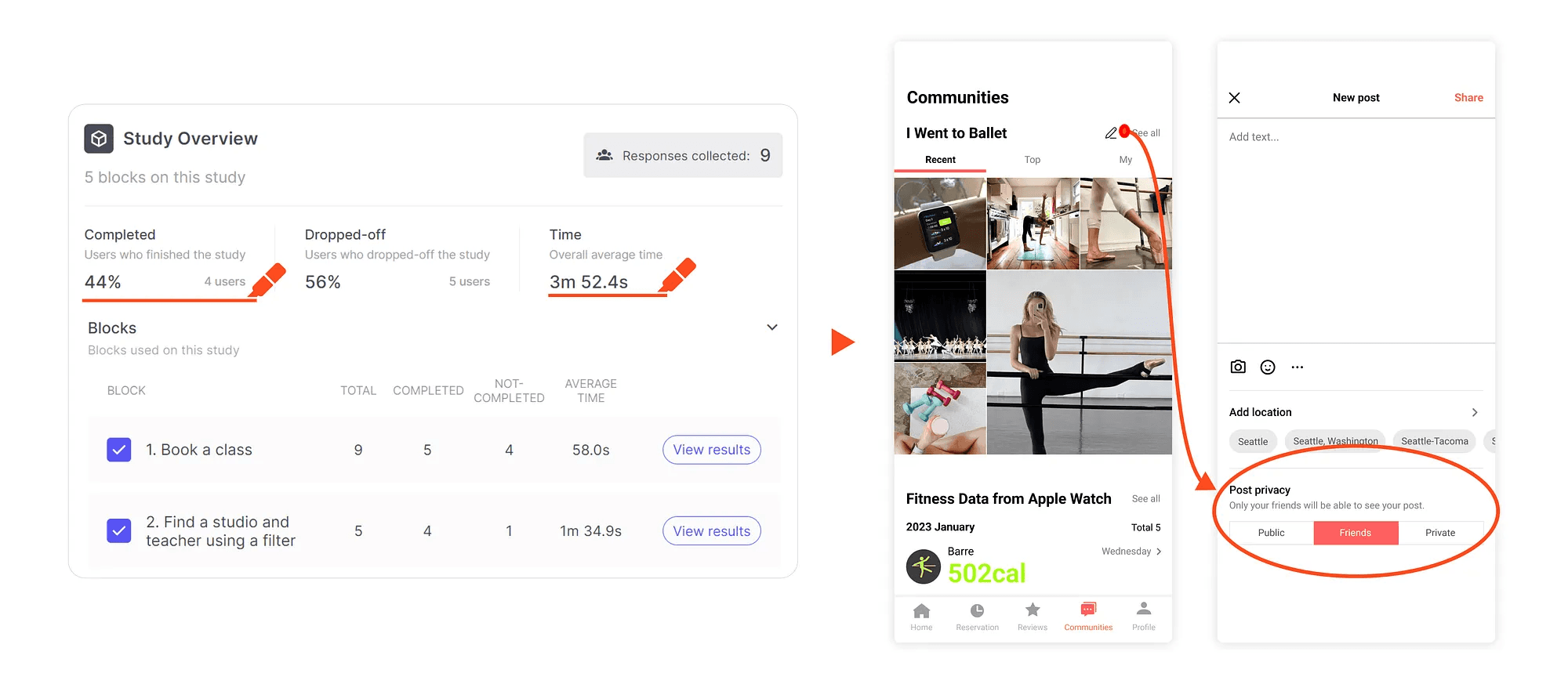 During testing, users highlighted challenges with the photo-sharing section, particularly the absence of a platform for sharing photos or recording class journals. To address this, I introduced a Post Privacy feature in the “I Went to Ballet” section, enabling users to set posts as public, private, or friends-only. This empowers users to discreetly track their progress and personalize their experience.