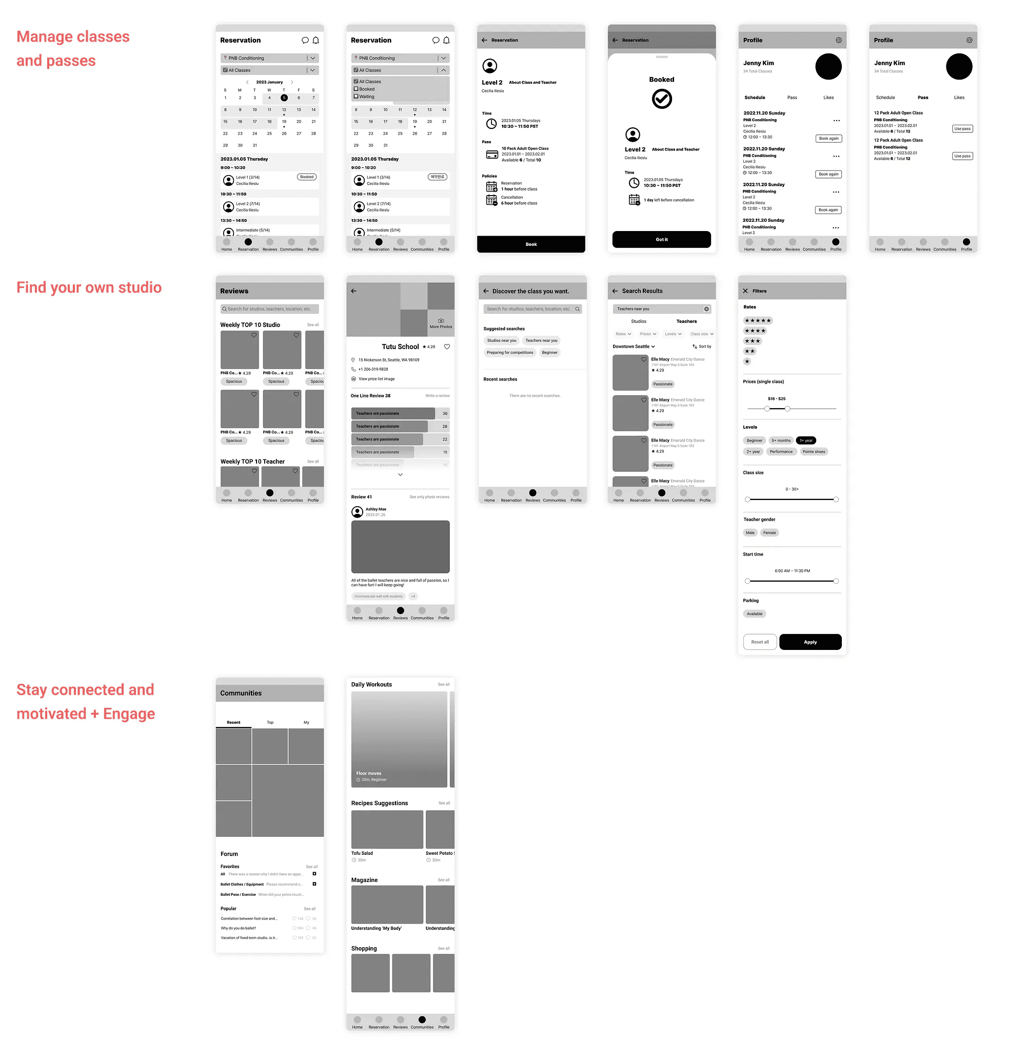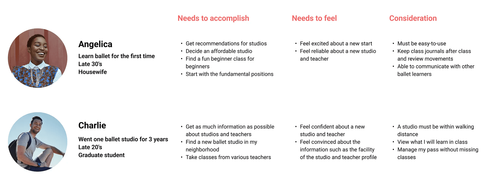 I selected two personas: Angelica who learns ballet for the first time, and Charlie who went one studio for three years. The situation and needs of the two people are different, so I analyzed them in terms of ‘needs to accomplish’, ‘needs to feel’, and ‘consideration’. Through this, I was able to put various perspectives of users in the app.