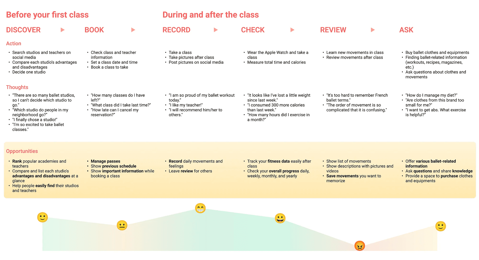 Through competitive analysis, survey, and user interview, now I know exactly what users need. So I divided taking a ballet class into six steps, and analyzed which users’ needs are related to the action & thoughts taken at each stage, and what opportunities these can lead to.