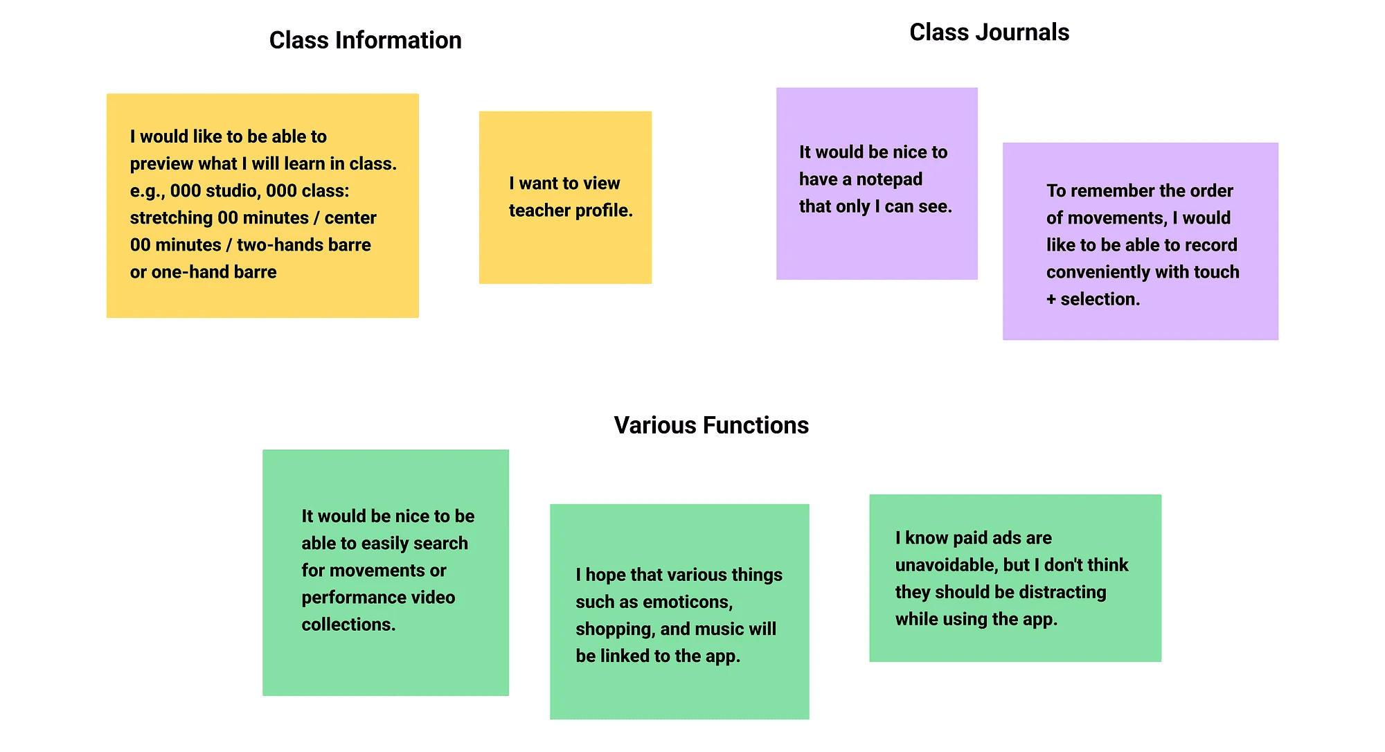 I’ve conducted interviews with six adult ballet learners. I’ve asked for their opinions on the ballet app they currently use then organized my data through affinity mapping.