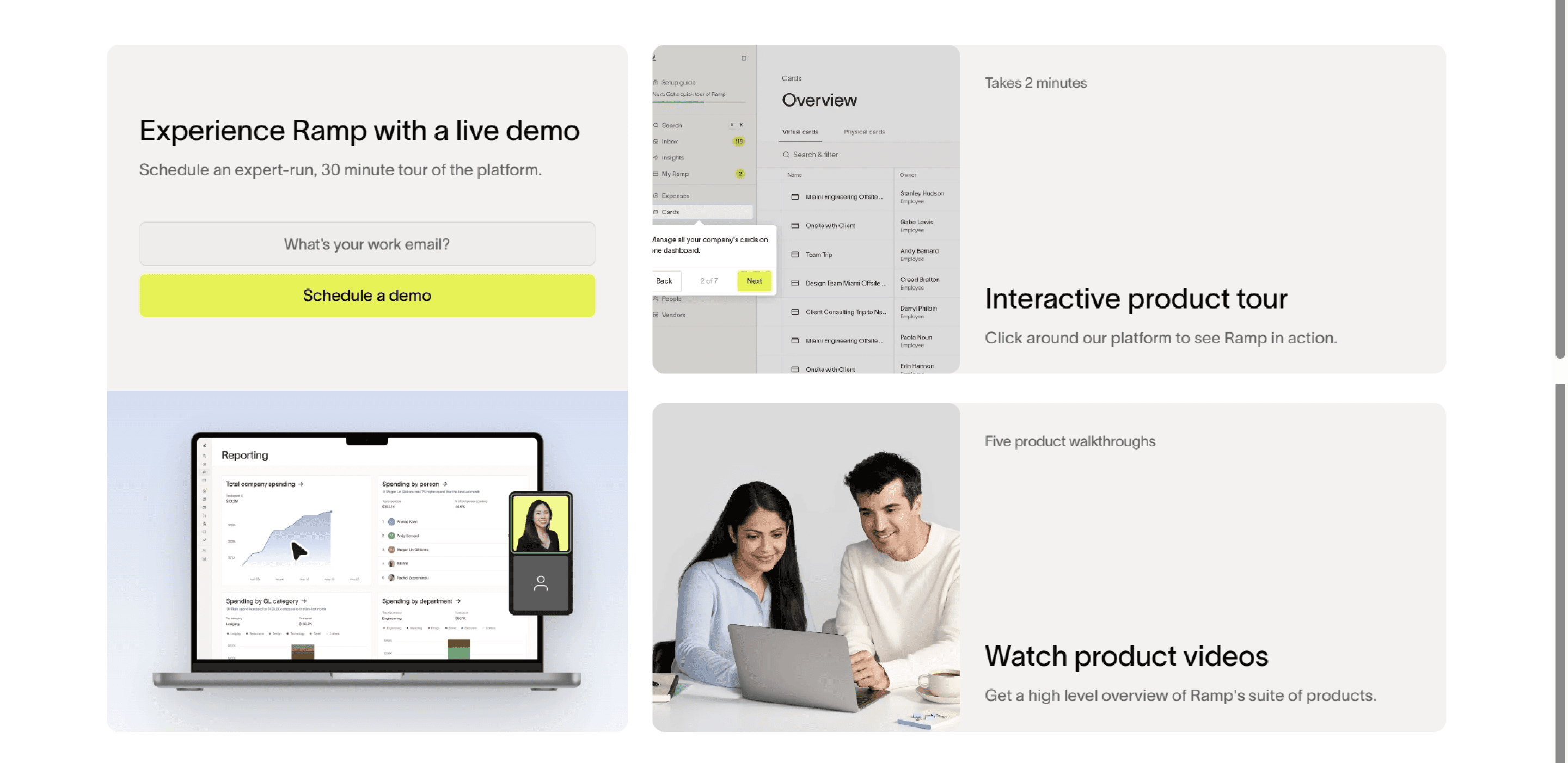 Brex leaves users unsure about how long the application will take or what to expect. In contrast, Ramp offers demo videos and user insights, giving applicants a clearer sense of the product before they commit.