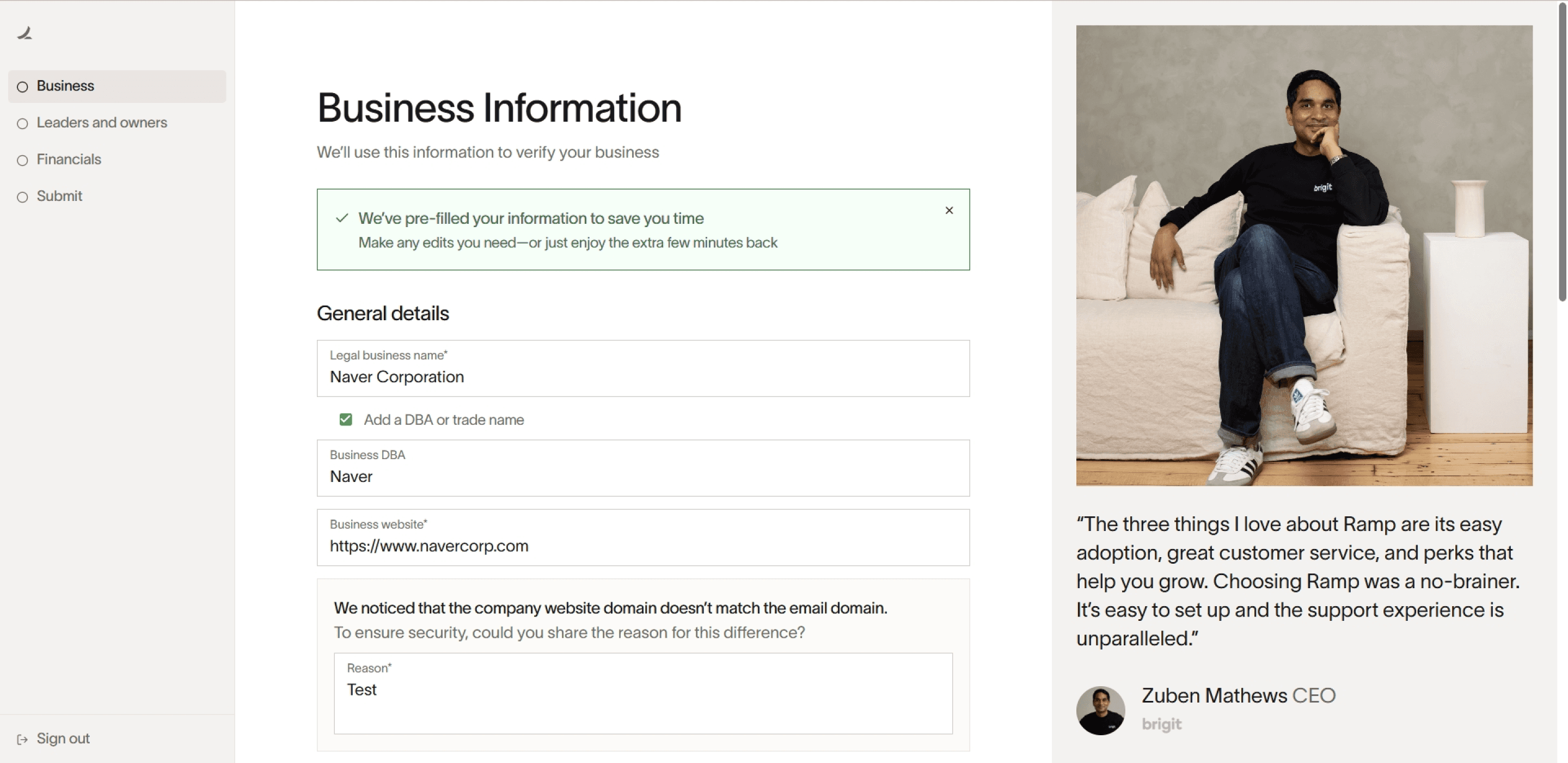 Brex’s application includes 17 screens with extensive data collection upfront, while Ramp reduces the flow to 10 screens by requesting only the necessary information.