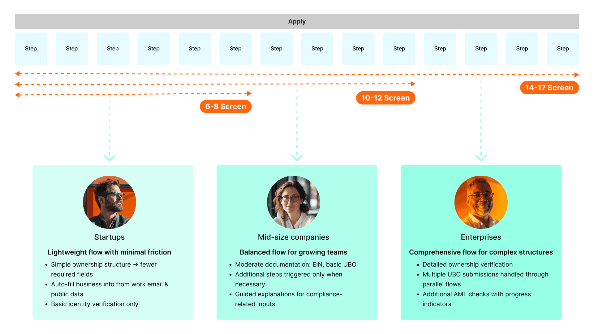 Brex already categorizes its customers by company size—startups, mid-size companies, and enterprises. By allowing AI to automatically detect company attributes and route users into the appropriate flow, Brex can reduce unnecessary steps for smaller companies while ensuring deeper compliance checks for larger organizations. This approach minimizes cognitive burden, improves completion rates, and better reflects the true regulatory needs of each customer group.