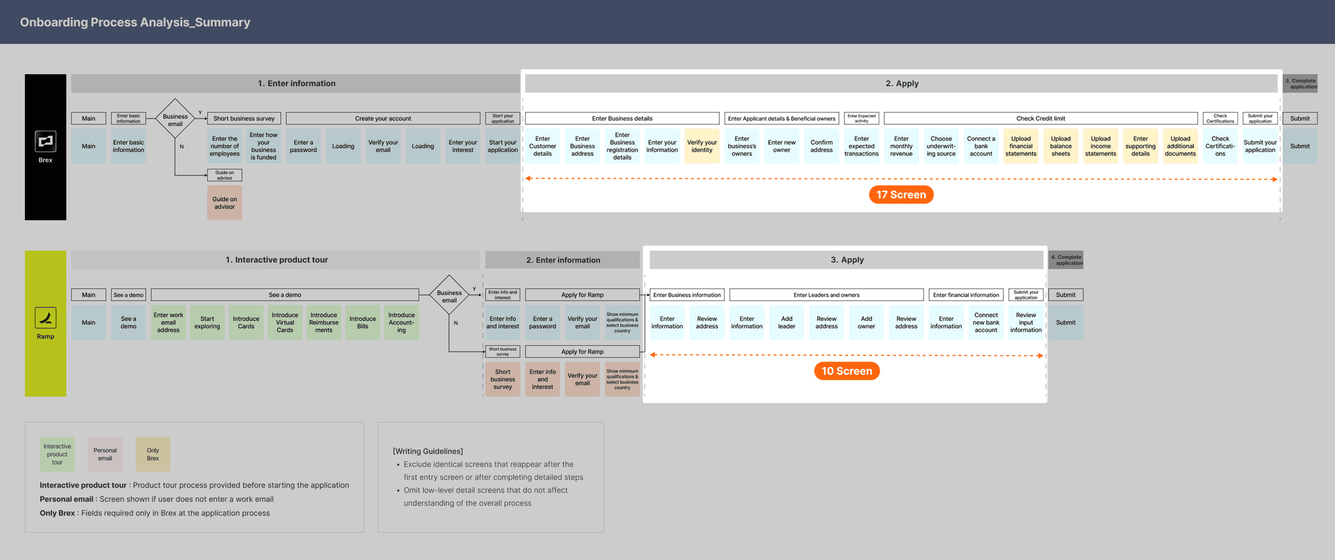 As a UX designer specialized in fintech, I conducted a comparative analysis of Brex and Ramp's onboarding flows to uncover user pain points, identify compliance-driven constraints (KYC/AML), and propose AI-assisted design solutions that streamline the process while maintaining regulatory integrity and user trust.