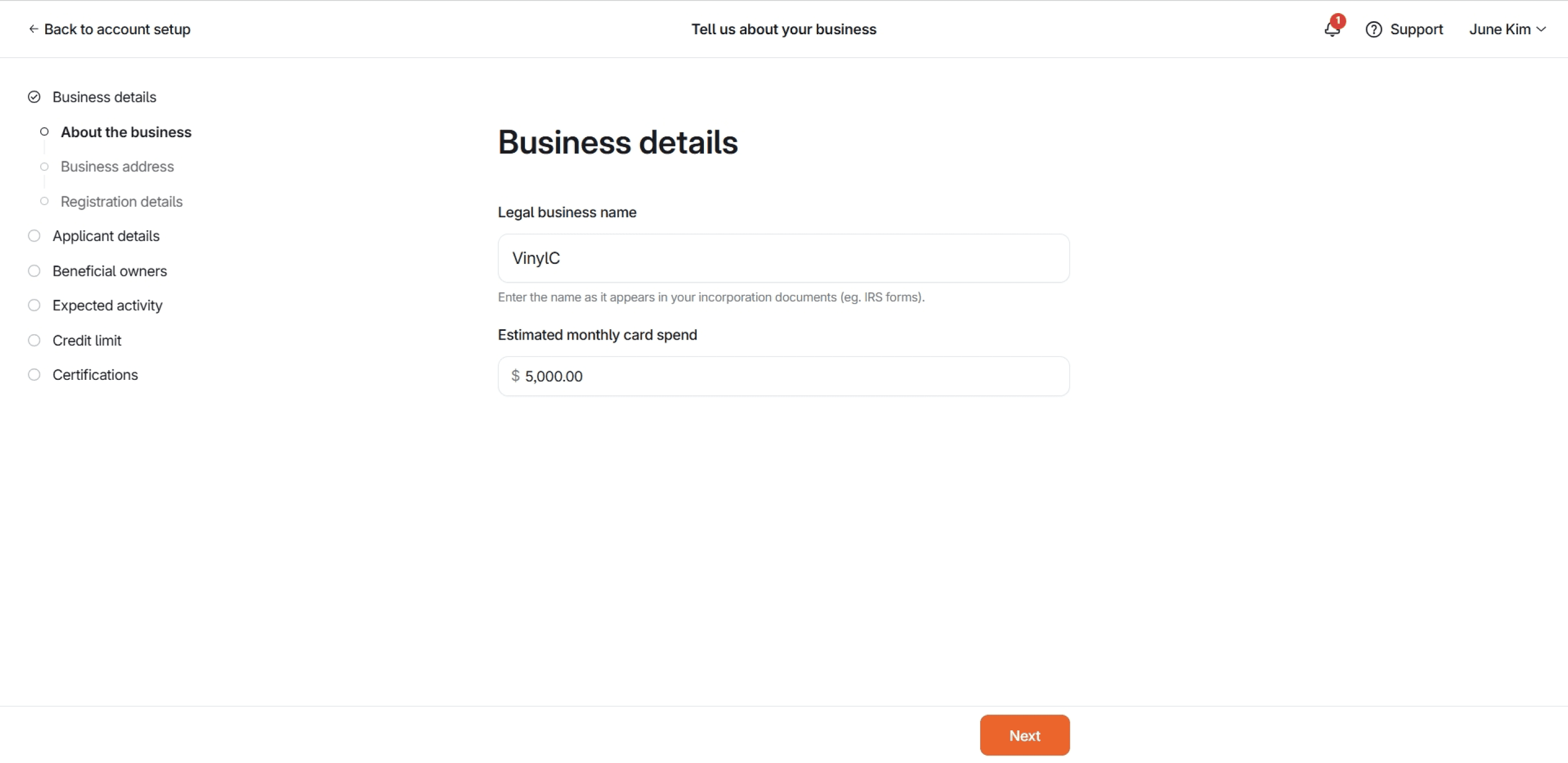 Corporate cards require validation of company ownership structure, EIN*, incorporation documents, and beneficial owners.