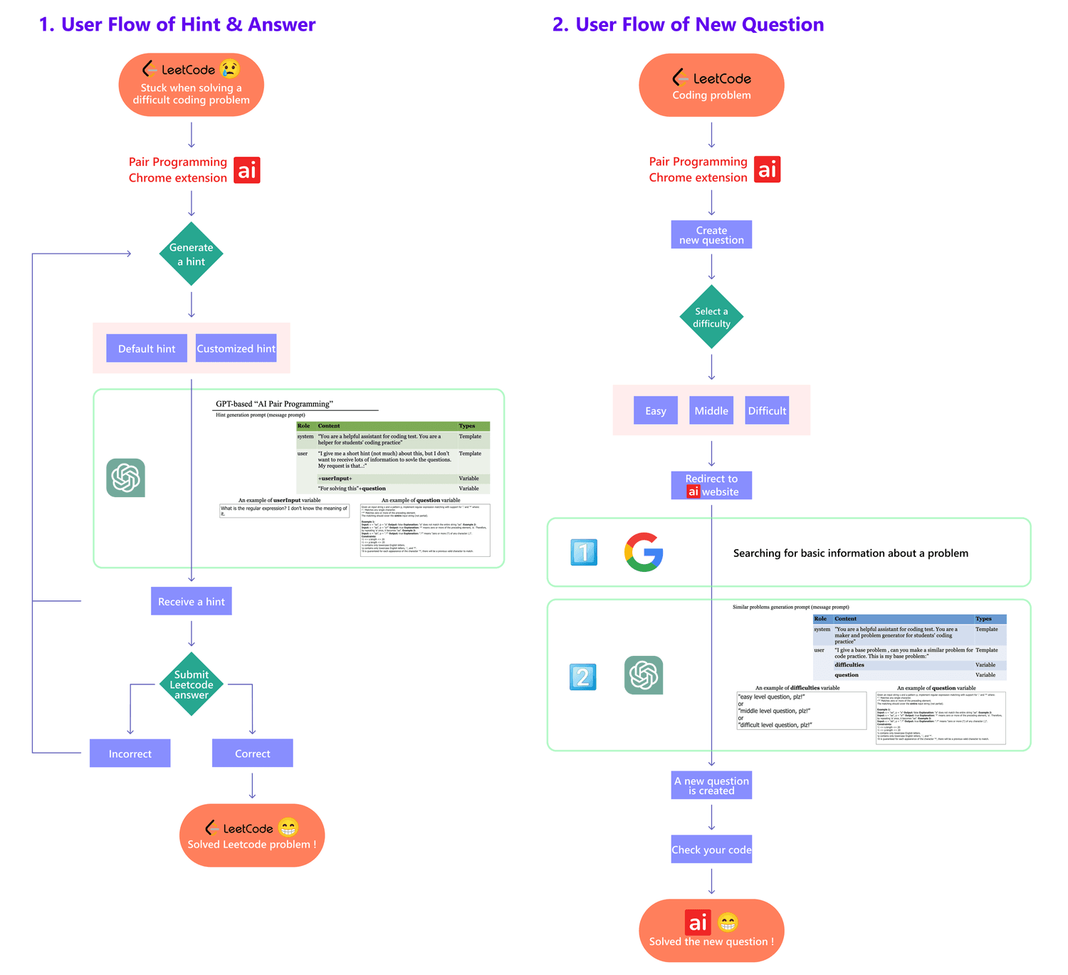 The flows illustrate how a user solving coding problems on LeetCode uses Pair Programming to get instant hints, discover related problems, and learn more effectively.