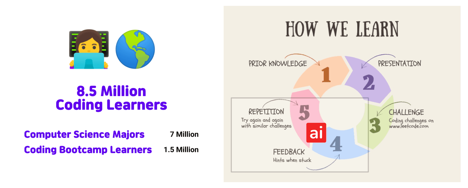 Our target audience consists of roughly 8.5 million coding learners, including both computer science students and coding bootcamp participants, particularly those focused on mastering algorithms. Pair Programming (our product) supports them during the (4) Feedback and (5) Repetition stages of learning to accelerate their skill development. Additionally, the product can be customized for classroom environments and scaled to cover broader topics, addressing the growing global demand for coding proficiency.