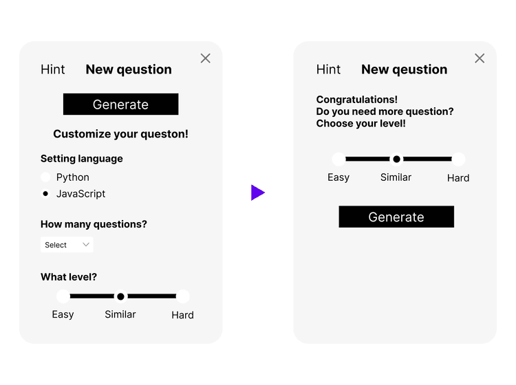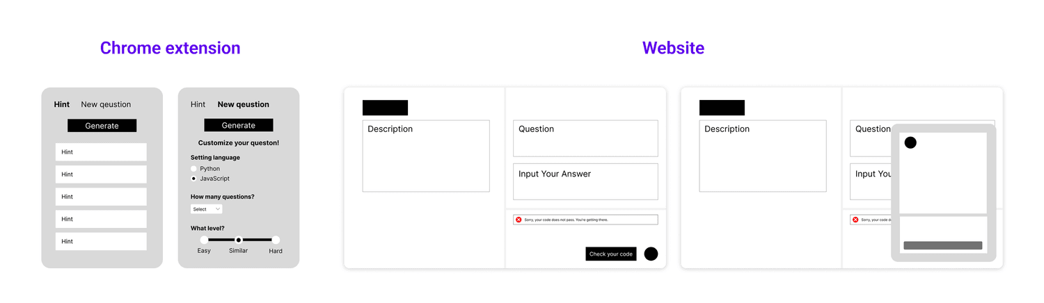 I designed a Chrome extension wireframe allowing users to select new question options, but refined it based on stakeholder feedback to focus on repetitive learning by selecting only question difficulty.