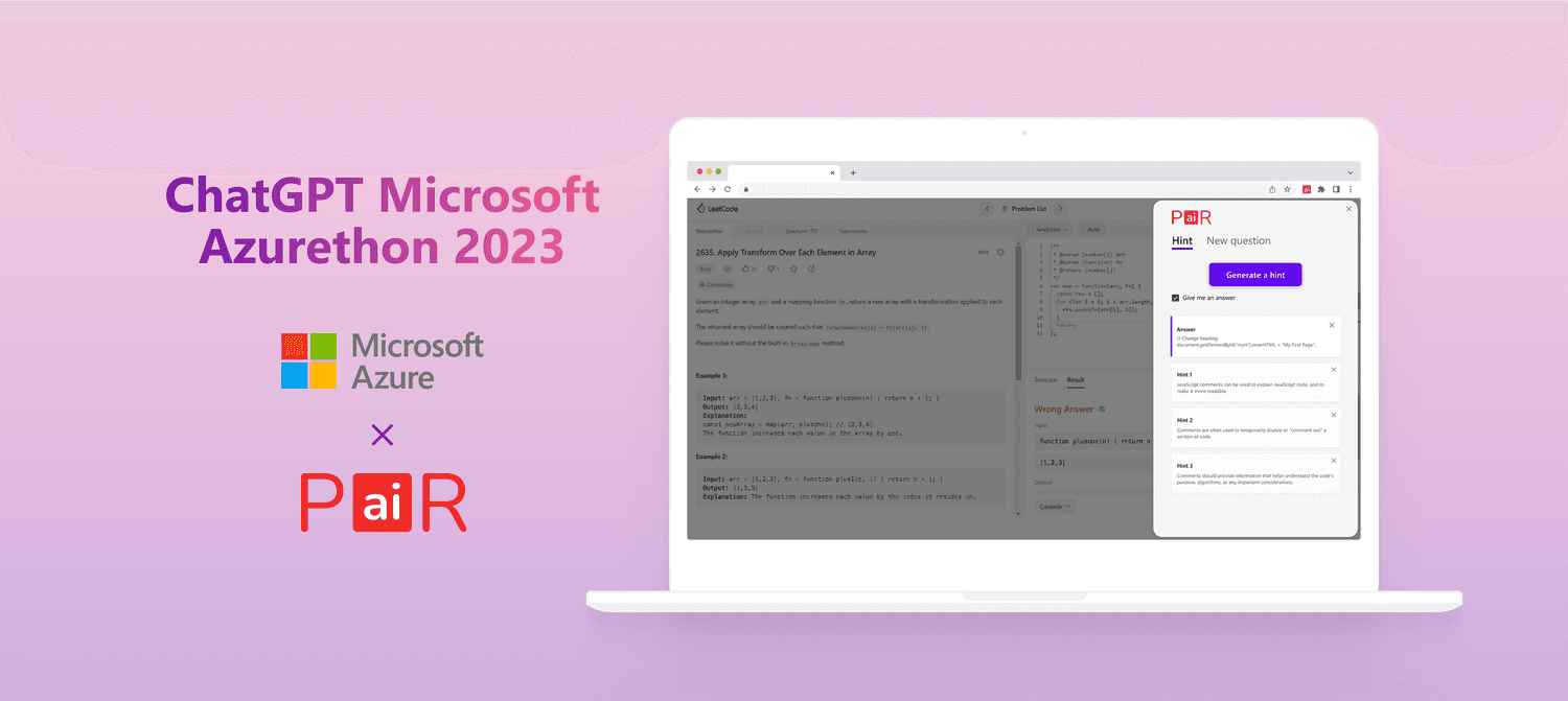 My team participated in ChatGPT Microsoft Azurethon 2023. We builded a Chrome extension called “Pair Programming Extension”, and a website. We wanted to apply AI to help students get feedback when they try solving new problems, and to get practice trying similar problems.
