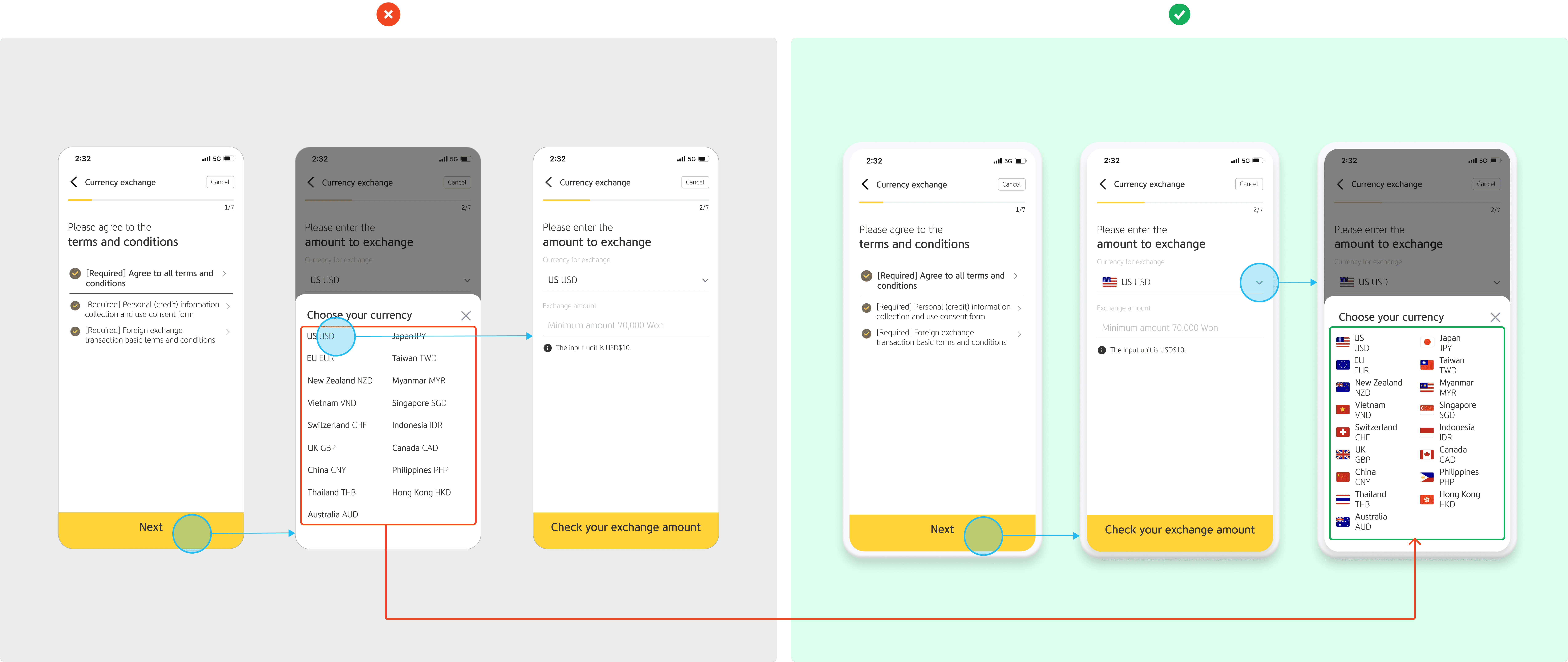 Country flags next to each currency name reduces cognitive load, helping users locate their desired currency more efficiently.